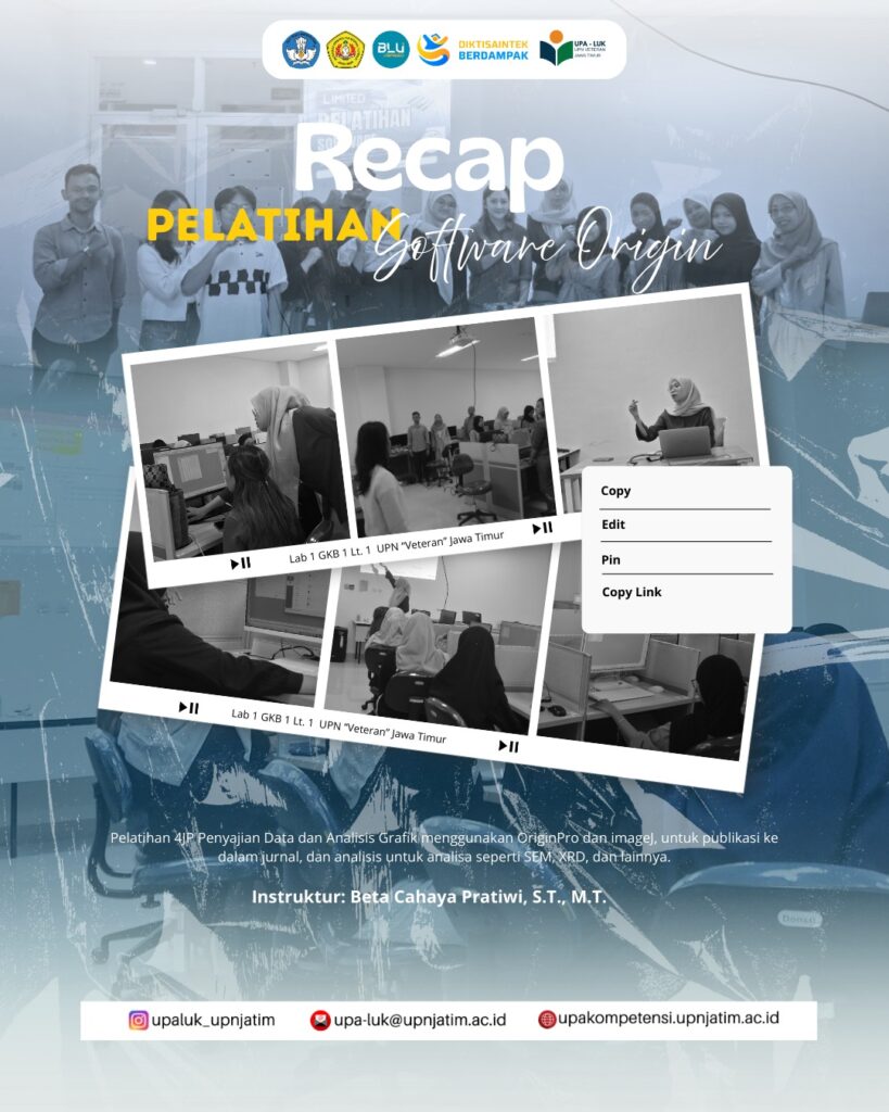 Rabu, 25 Februari 2026, Pelatihan OriginPro sukses diselenggarakan oleh Tim Bidang Pendidikan dan Pelatihan UPA LUK di Laboratorium Komputer, Gedung GKB 1 UPN “Veteran” Jawa Timur. Kegiatan ini dilaksanakan sebagai bentuk komitmen dalam meningkatkan kompetensi akademik mahasiswa di bidang pengolahan dan analisis data ilmiah.